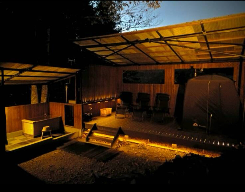照明設備が無事に完成したことで、日中はもちろん、夜でも落ち着いた雰囲気の中でサウナを楽しめる空間になっています。